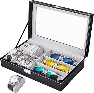 APL Display Schmuckkästchen für Uhren und Sonnenbrillen, 6 Uhren, Schmuckkästchen und 3 Fächer, Sonnenbrillen-Organizer, PU-Leder Brillenetui für Uhren und Sonnenbrillen, für Damen und Herren, schwarz